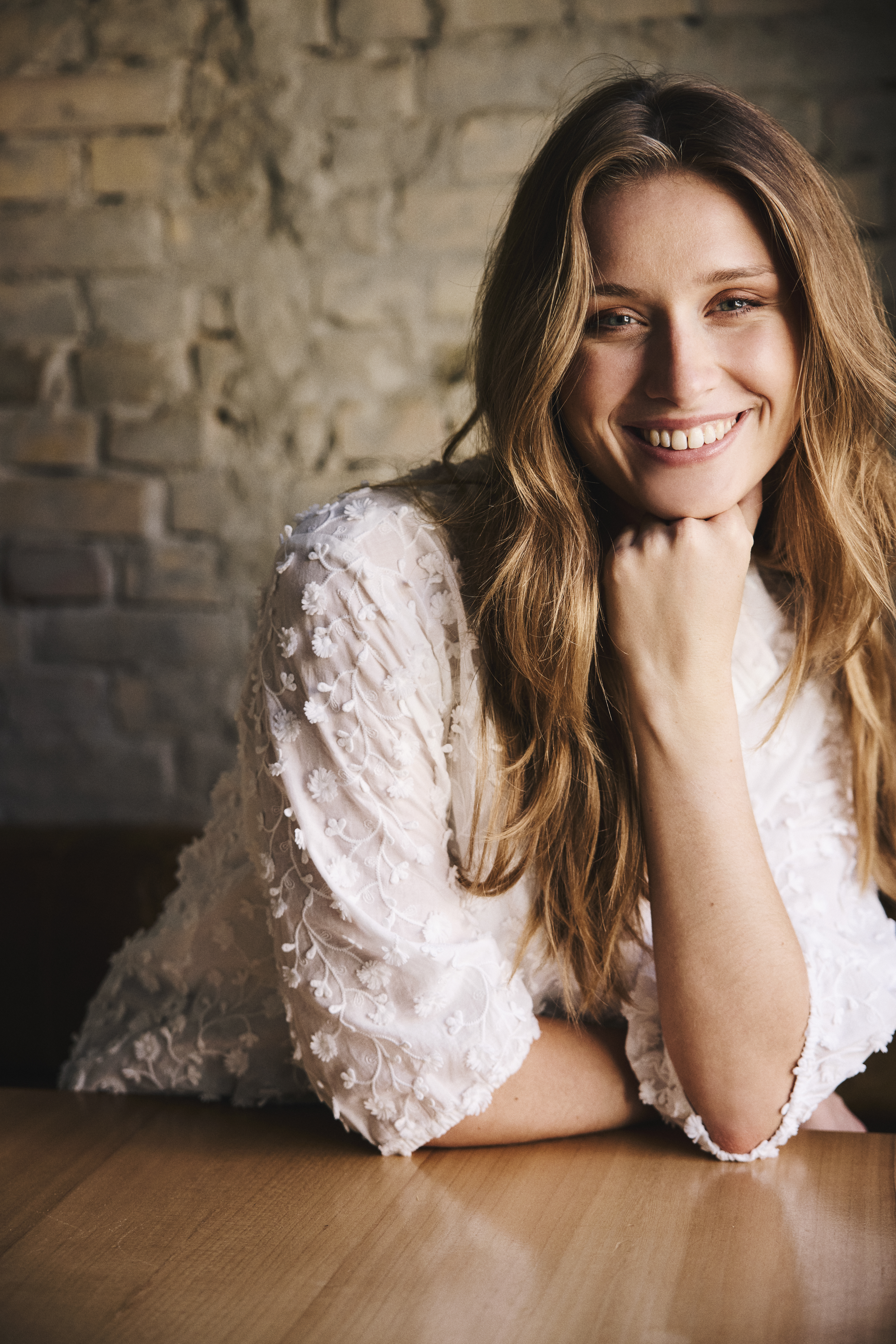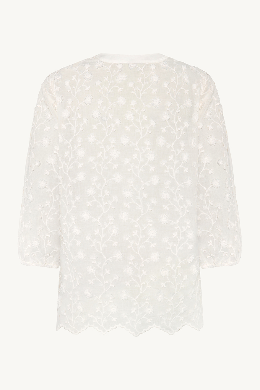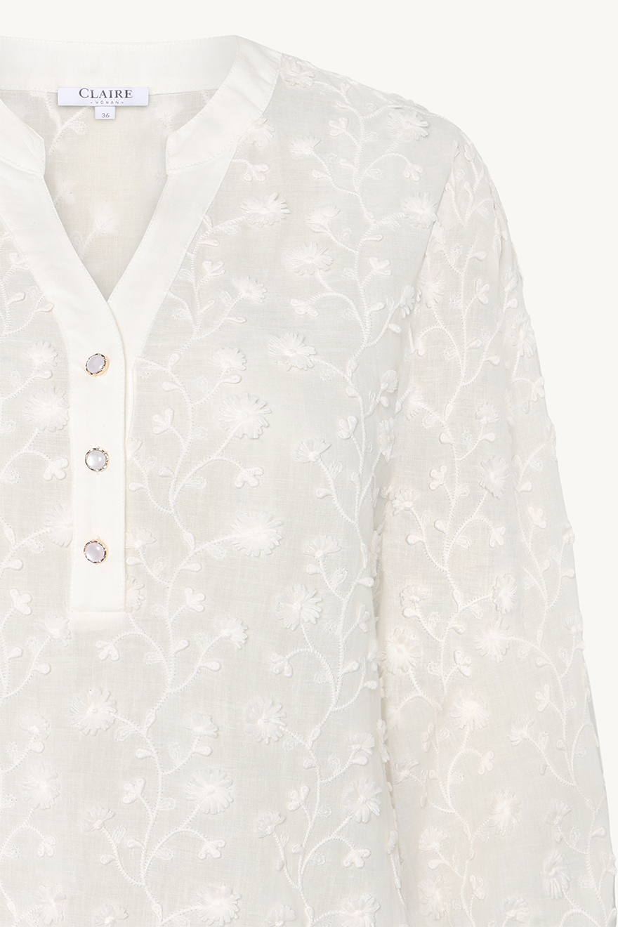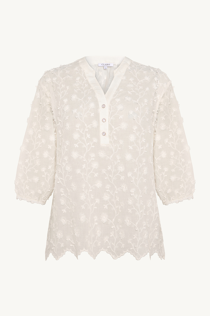 Kaunis kesäinen puuvilla paita, jossa kolmeulotteiset kukkakoristeet. Hihan pituus 3/4, V-kaula-aukko ja kauniit koristenapit.