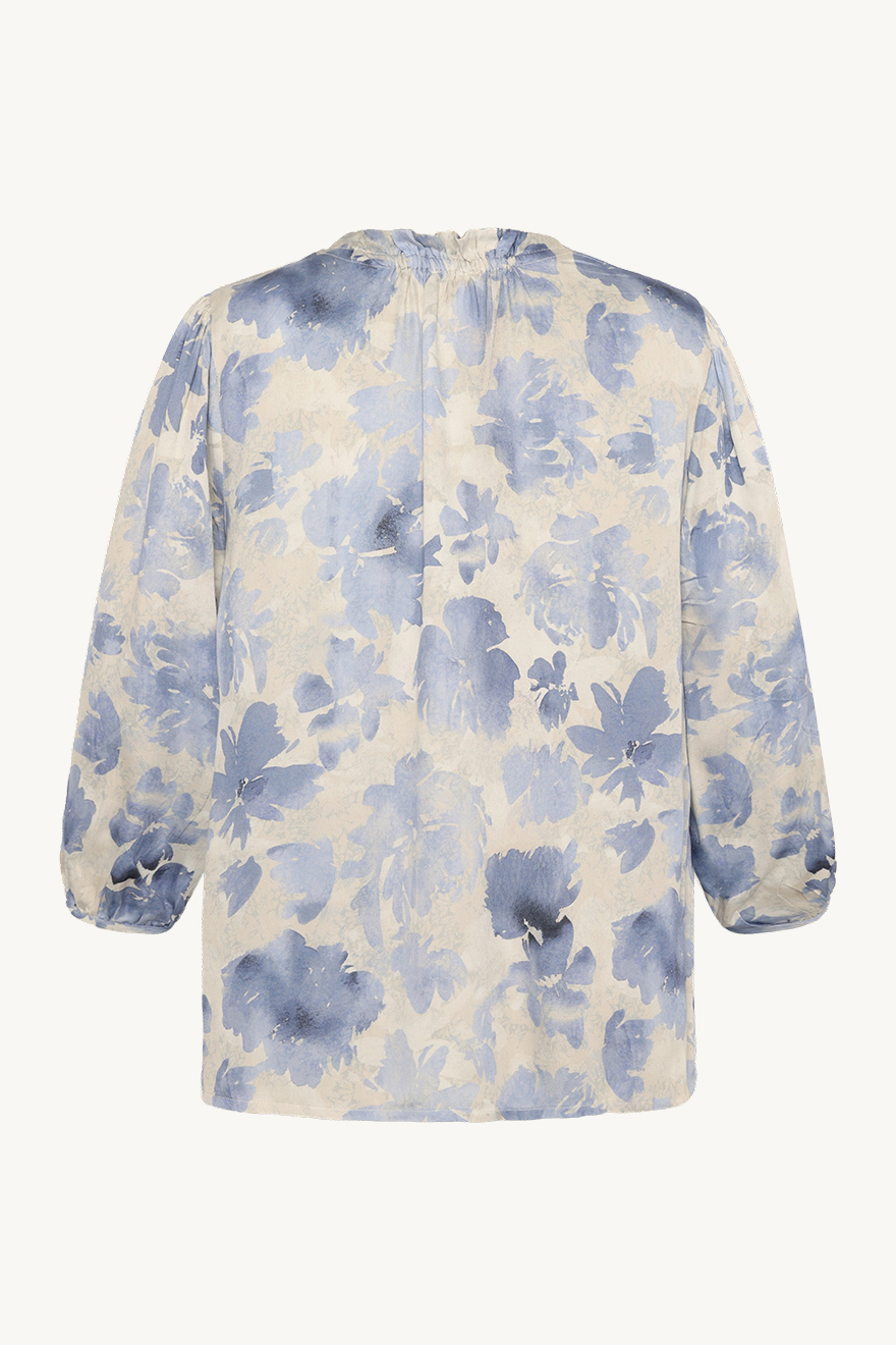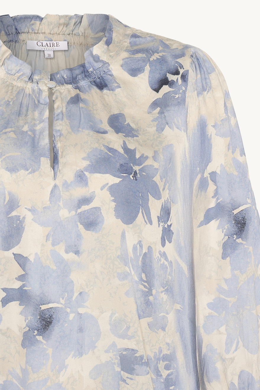 Kauniin herkkä vaalean sinisin kukin koristeltu Raquelita-paita sopii niin juhlaan kuin arkisempaankin menoon. Puseron pohjasävy on luonnonvaalea. Olkapäissä on pienet rypytykset. Kaula-aukko on pyöreä ja edessä on pieni frilla sekä nappikiinitys, jonka voit pitää joko auki tai kiinni.